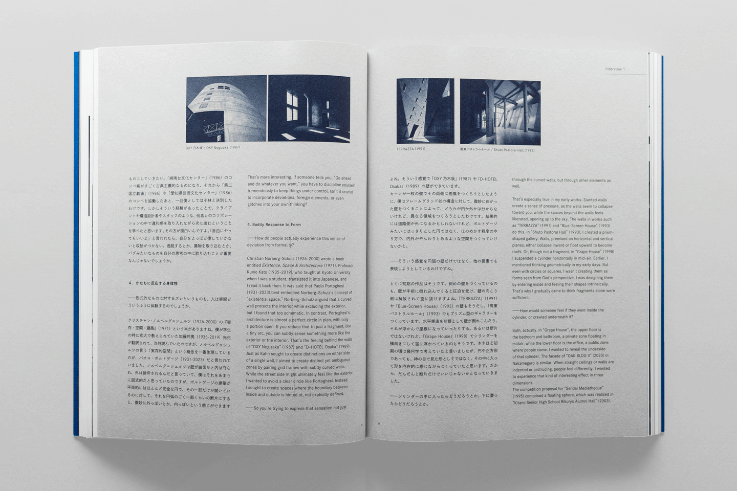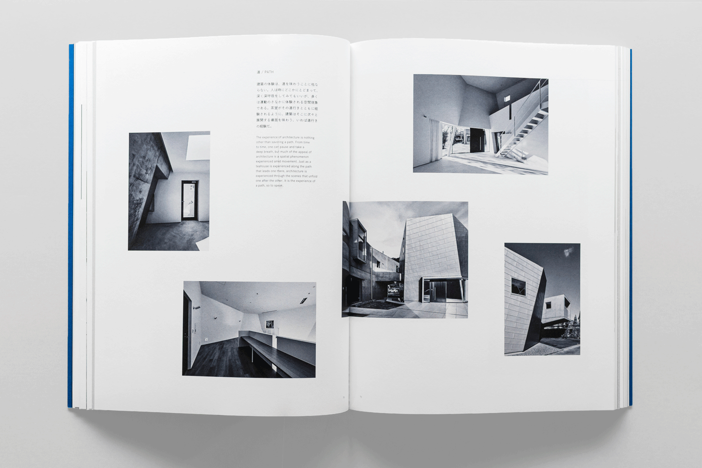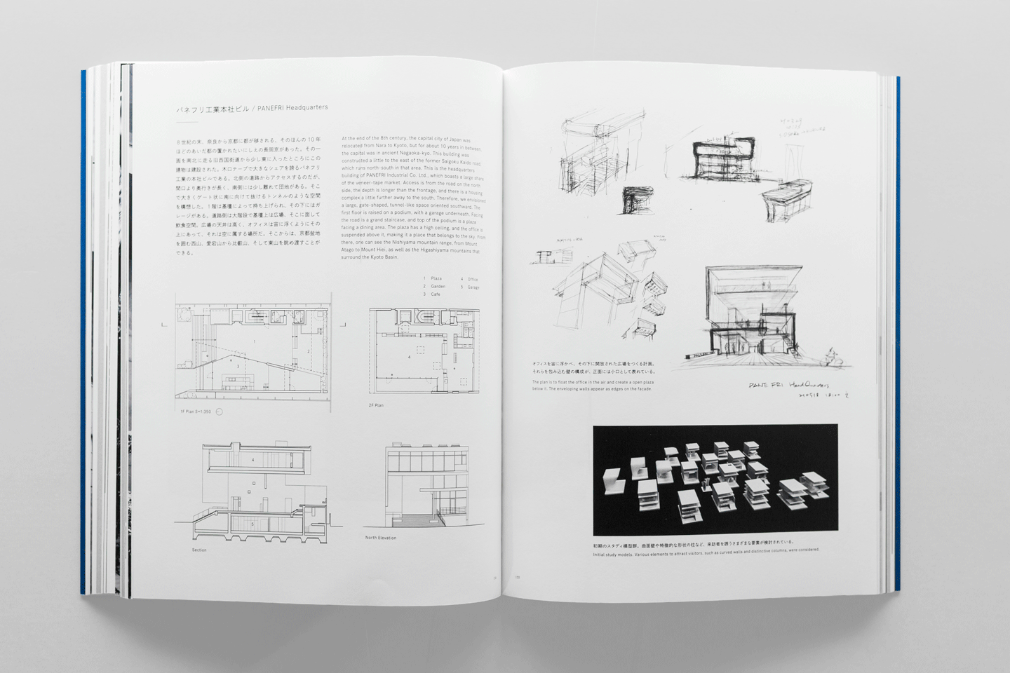自由で滑らかで曲面に包まれた「新宿瑠璃光院白蓮華堂」、多面的な造形の二棟が中庭を囲む「AGIRLS本社ビル」、空に浮かぶオフィスの下にゲート状の広場をもつ「パネフリ工業本社ビル」など、15作品を系統ごとに掲載。その構成から「形」に込められた意図を浮かび上がらせる。